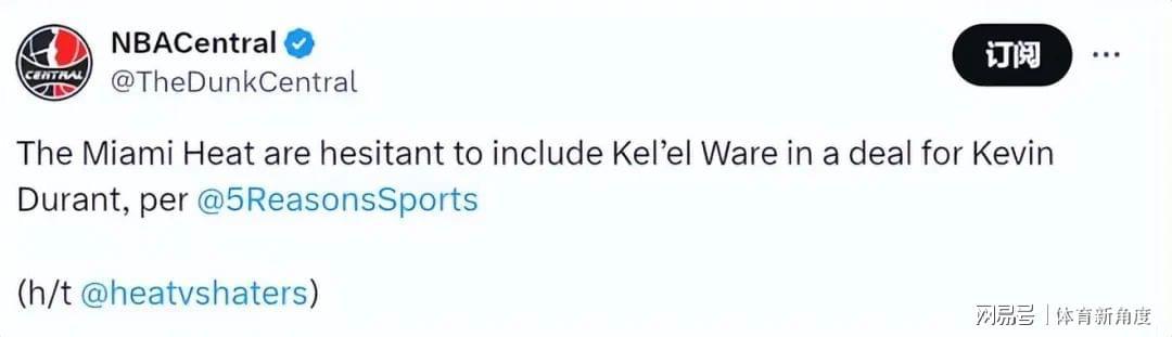 与此同时,热火队记者Ira Winderman表示,尽管尼克斯队与马刺队可能无缘杜兰特,但热火队确实对杜兰特表达了浓厚的兴趣。然而,关键在于这份兴趣是否能得到杜兰特的积极回应。Winderman提到,热火队与太阳队曾在今年2月的交易截止日前讨论过杜兰特与巴特勒的互换方案,但后者最终选择了加盟金州勇士队(尽管勇士队最初曾接近得到杜兰特,但被其否决)。他还透露,热火队的明星球员阿德巴约与希罗将不会出现在任何关于杜兰特的交易谈判之中。